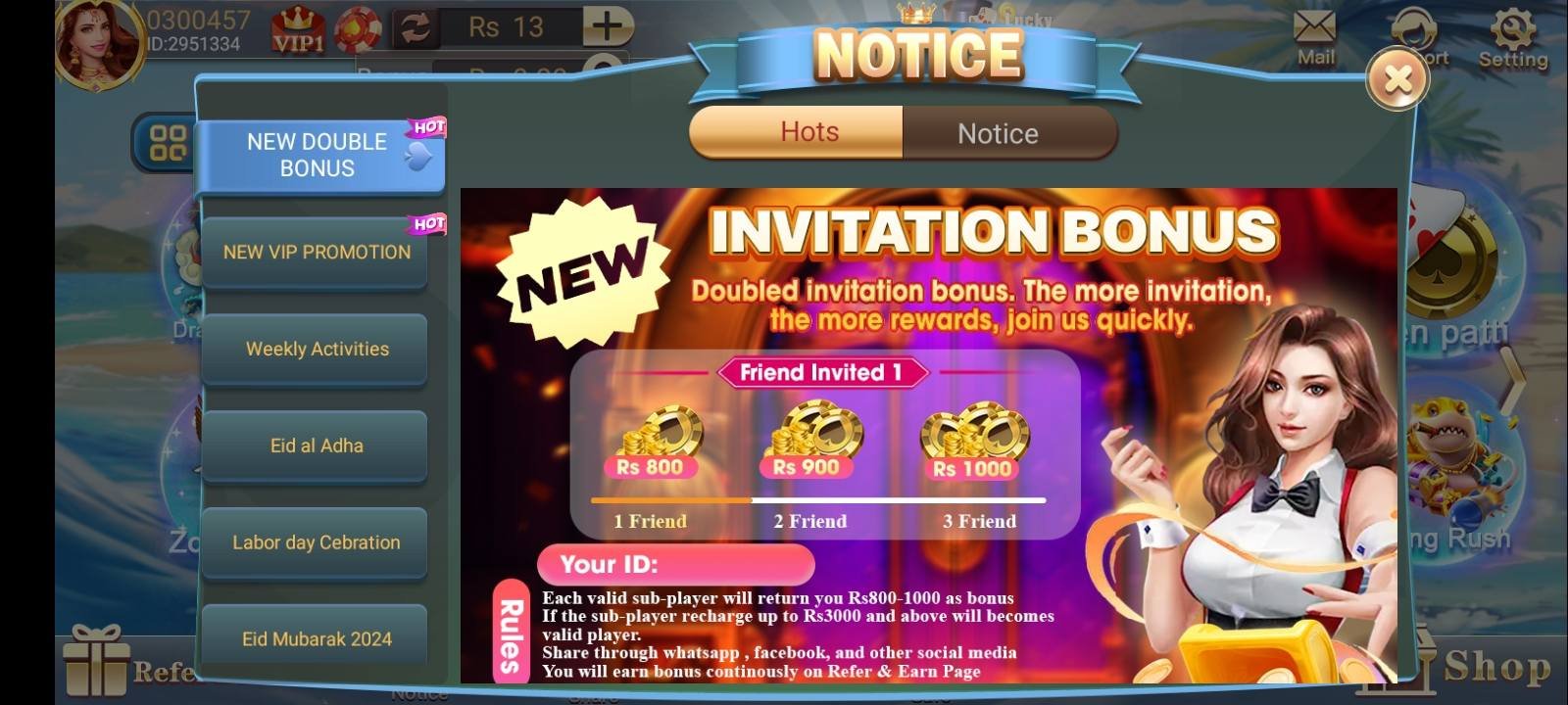The referral system allows players to invite their friends and family members to join the platform. When new users register through a referral link and start playing, the inviter may receive a referral bonus.